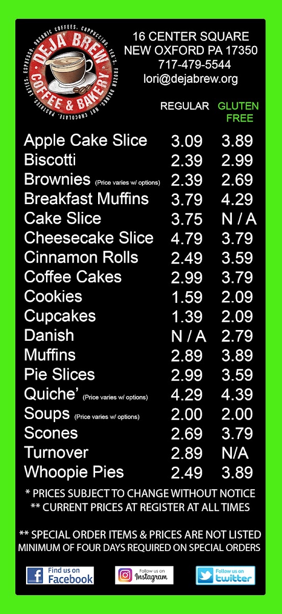 Welcome to Deja Brew Coffee & Bakery, your cozy retreat in New Oxford, PA. Here, the aroma of rich espresso mingles with the sweetness of fresh pastries, creating a delightful atmosphere for coffee lovers and food enthusiasts alike. Whether you’re indulging in a creamy Cappuccino topped with steamed milk foam or savoring the layered flavors of a Caramel Macchiato, each sip is a celebration of quality and taste.